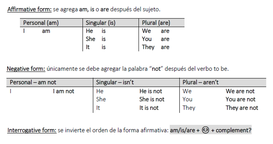 El verbo “to be” significa “ser” o “estar” y es utilizado para describir personas, animales, objetos, etc. Algo que debes tener muy en cuenta con este verbo es que, en presente, se utilizará con tres formas distintas dependiendo si hablamos en personal, singular o plural.