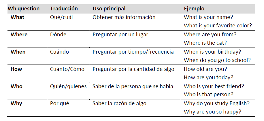 En inglés dichas preguntas son denominadas WH questions y, al igual que en español, son usadas cuando se pretende obtener más información acerca de algo.