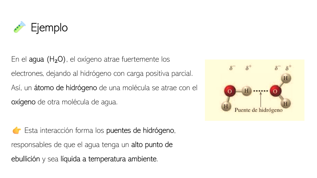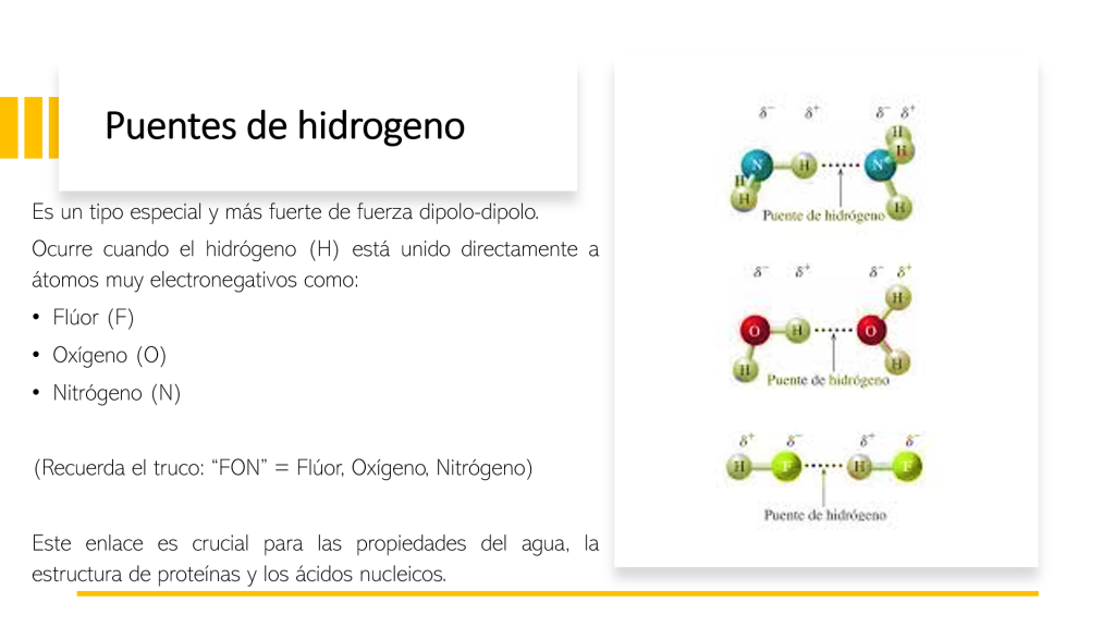 Procesos biológicos: Desempeñan un papel en la estructura de moléculas biológicas, como la doble hélice del ADN, que está estabilizada por puentes de hidrógeno entre las bases nitrogenadas.